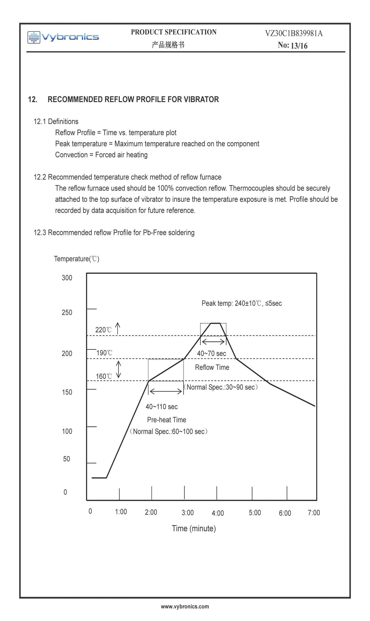 At a height of only 1.7 mm above the PCB, this unique mid-mount vibration motor design allows for space saving, low profile designs. It is mounted in a rectangular cut out in the PCB and is reflow soldered. While coin vibration motor are available in thicknesses as small as 2.0 mm, this mid-mount vibration motor offers the distinct advantage of generating a vibration force that is perpendicular to its body, which in most cases, will also be perpendicular to the end users skin. This is desirable for the user to have the best haptic feedback experience. Coin type motors generate a vibration force that is parallel to its largest surface. These are packaged on tape / reels of 1000 pieces per reel and are designed to be pick-and-placed directly from the reel. They are an excellent choice for high volume mass production. They have a “core” which allows them to withstand the high temperatures associated with the reflow soldering process. These mid-mountable vibrator motors can be damaged by excessive heat. Please be sure to follow the reflow oven temperature profile found in the motors data sheet. If these motors will be hand soldered ( ie. making prototypes) , do not use flux and use a low wattage iron for as short a time period as possible. Please note that these mid-mount vibration motors CAN NOT be washed.