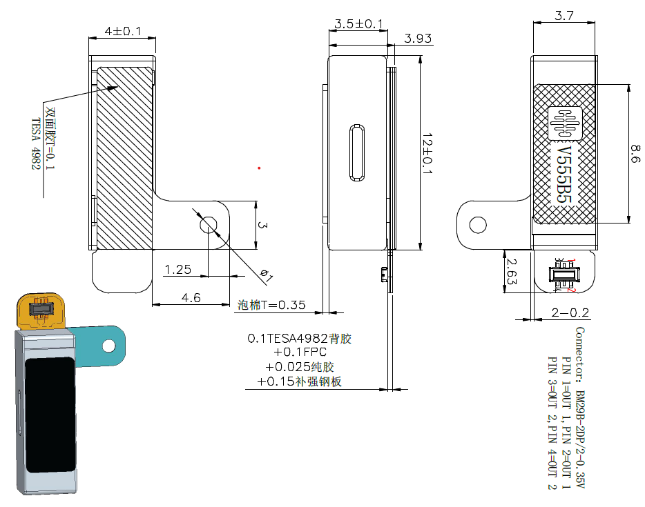 The  VLV041235L-FP255  rectangular, Z-axis LRA can be used for a variety of haptic feedback applications. It is based on our popular VLV041235L.  It makes use of the Hirose BM29B-2DP/2-0.35V(51) ultra small FPC to Board connector.    This LRA generates haptic feedback in the Z-axis and can be used for a variety of haptic feedback applications.   Please note that the BLUE  colored tab is a removable plastic release tape protects the double sided adhesive under the LRA.  This must be removed prior to use.  This LRA is different than most rectangular LRA's which oscillate in the X plane, along the length of the device.  Like all LRA's this device is typically connected to a LRA  driver IC which produces the AC  drive signal for this device.